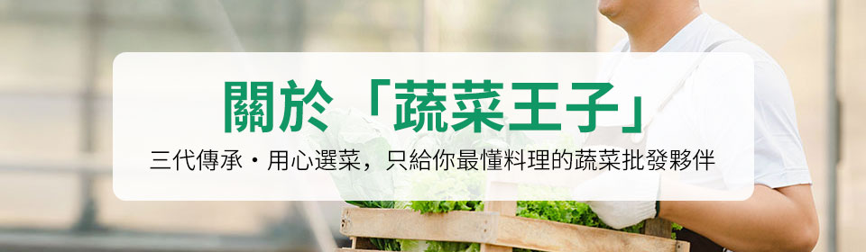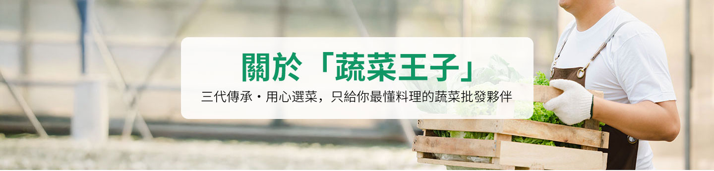 「蔬菜王子」源自農家背景,從爺爺起就在市場耕耘蔬菜批發,至今已傳承三代,深耕北部市場多年。我們不只是供應新鮮蔬菜,更熟知每一種蔬菜的風味、口感與料理方式,能協助餐飲業者挑對品項、用對方法,為客人的餐桌增添風味與品質。